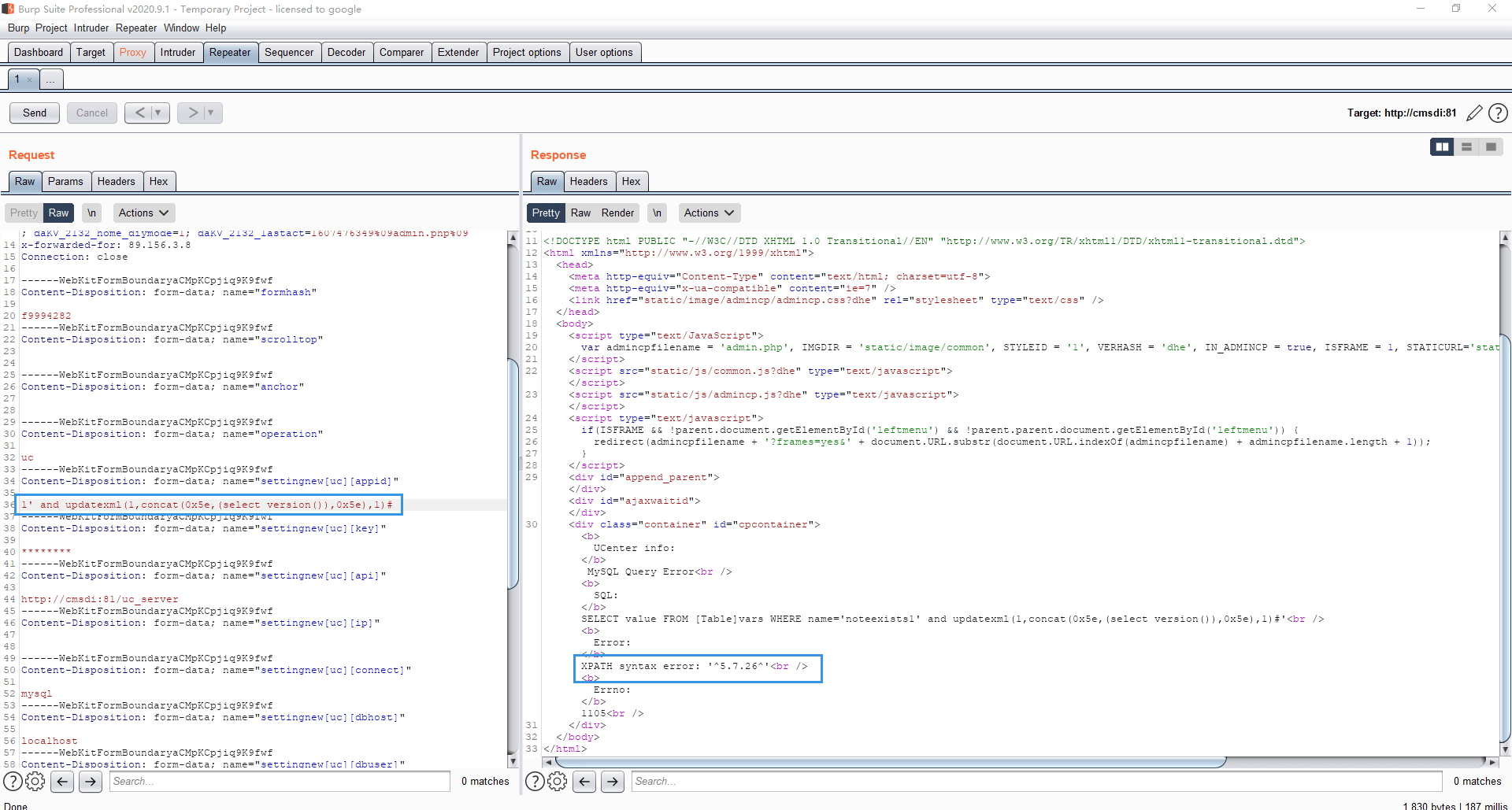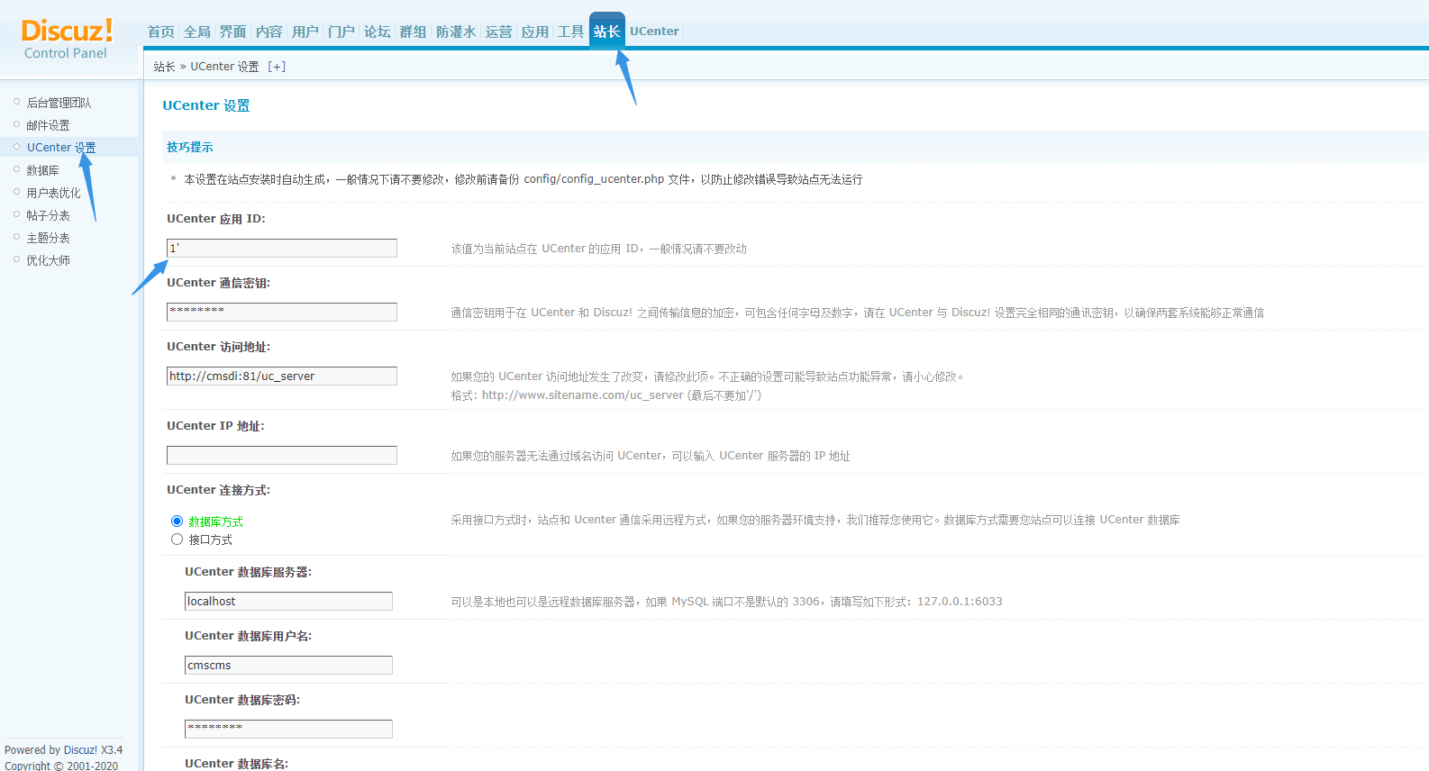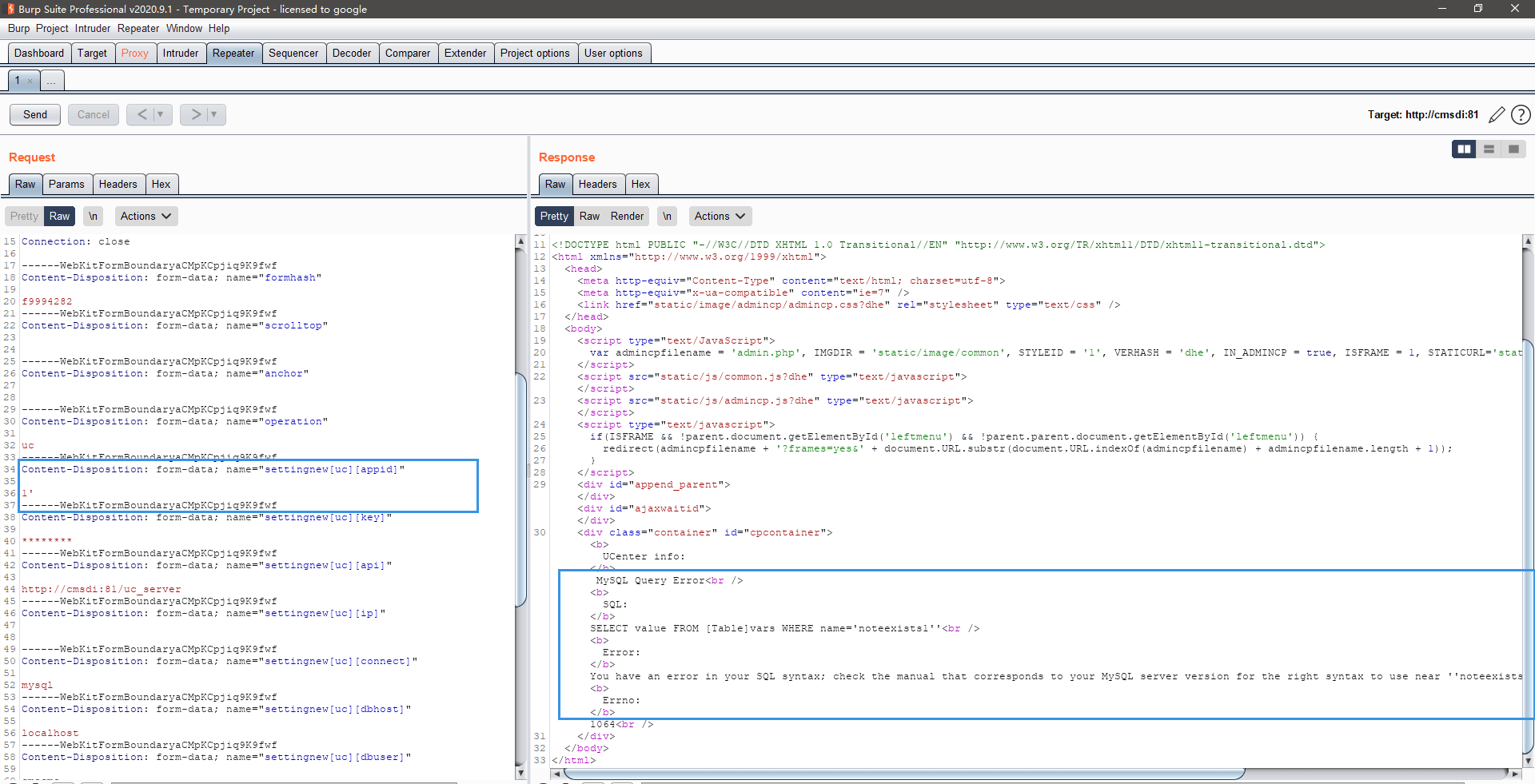 来到后台页面, 在 UCenter 应用 ID 位置的参数添加单引号并抓包
