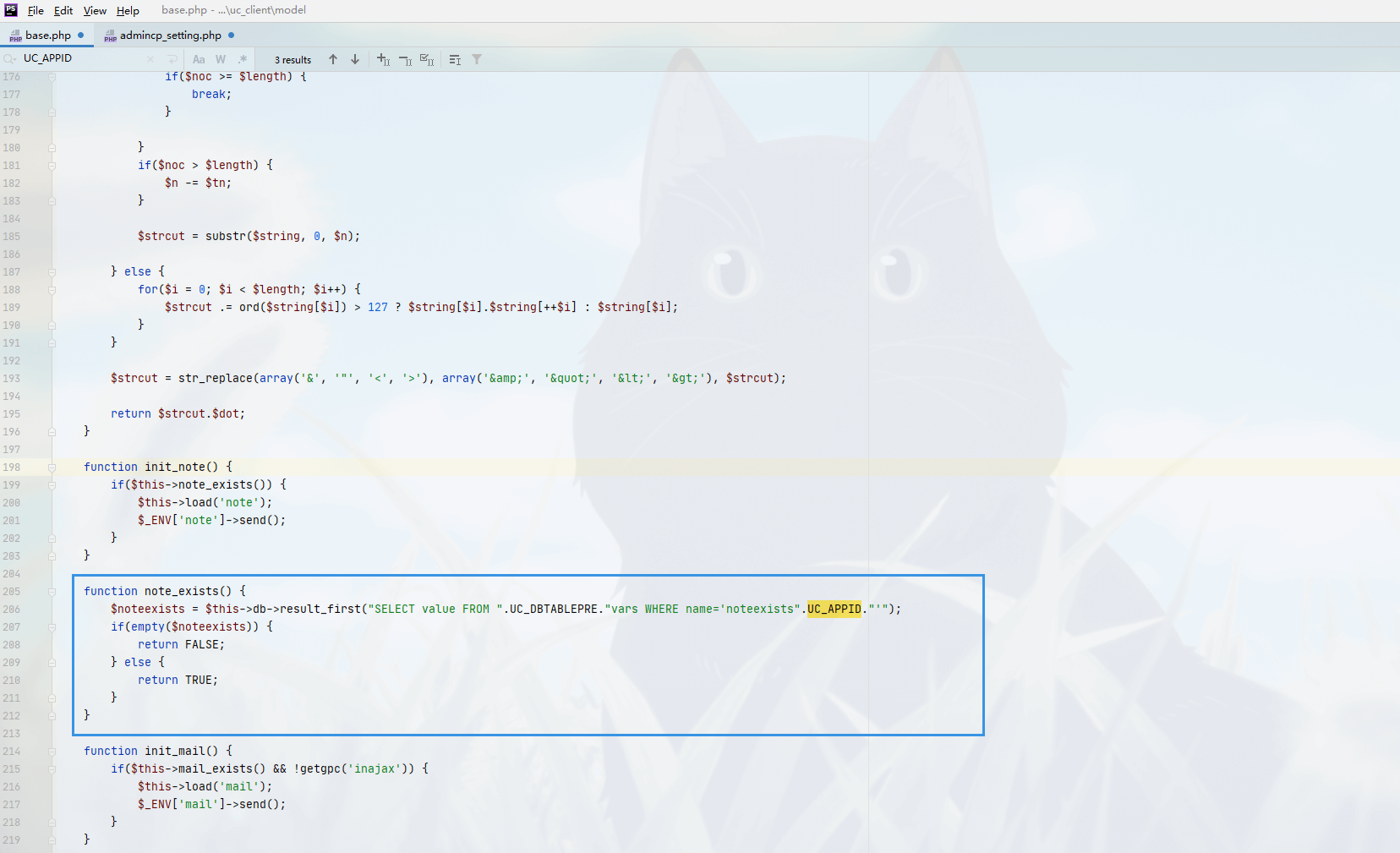 根据报错语句找到SQL语句执行点,在文件uc_client\model\base.php 中的 206行