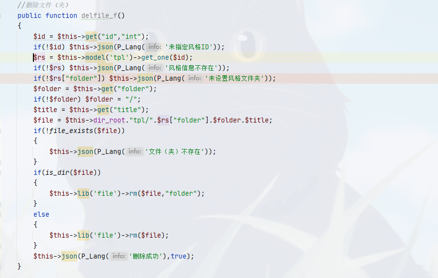 出现漏洞的函数在文件 framework/admin/tpl_control.php 中的 delfile_f() 函数