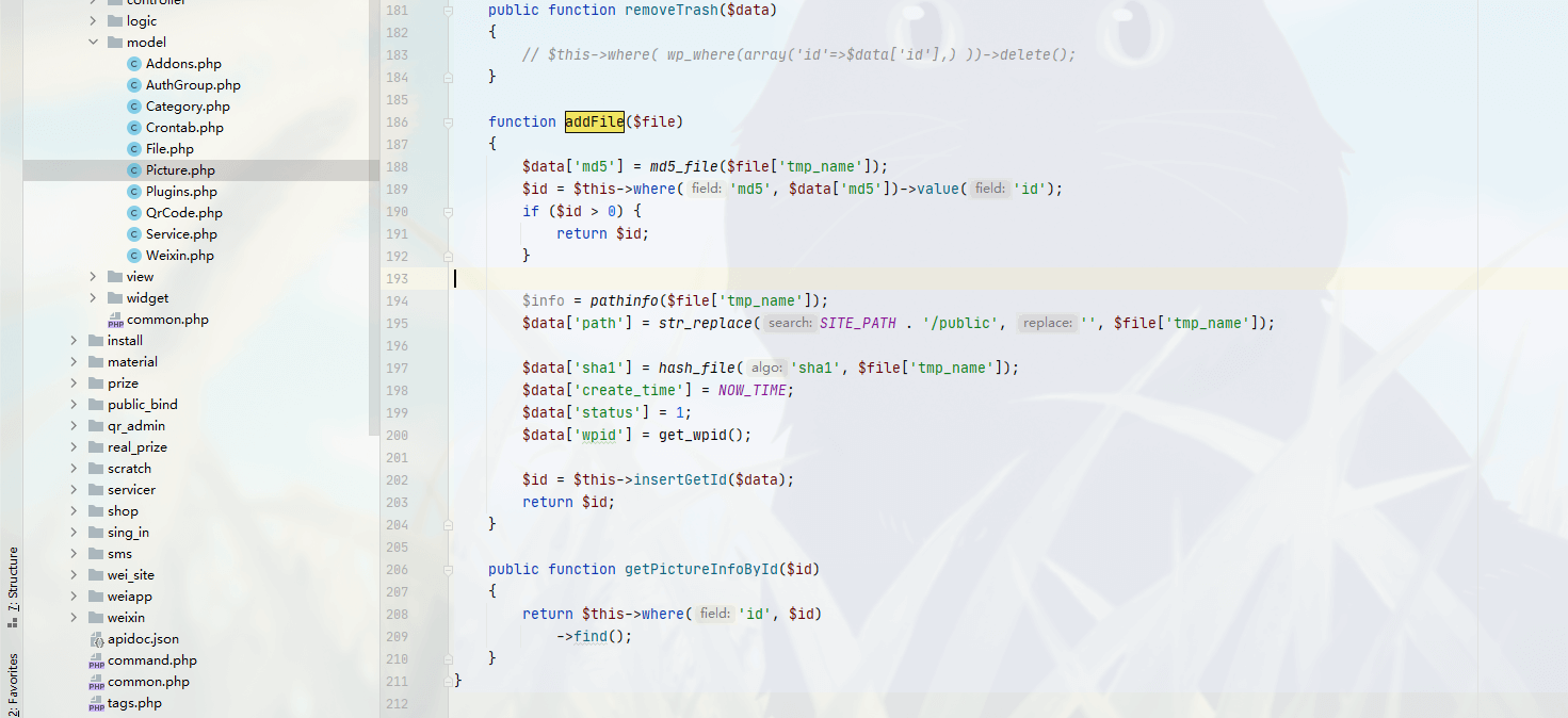 首先注意到函数的标识为public,也就是这个函数是公共调用的,并且变量picUrl为可控变量