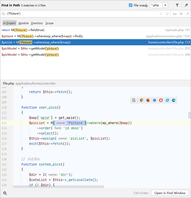 我们现在则需要找到不需要登录的地方来获得这些数据,所以可以全局去查找调用了这个 Picture 表的地方