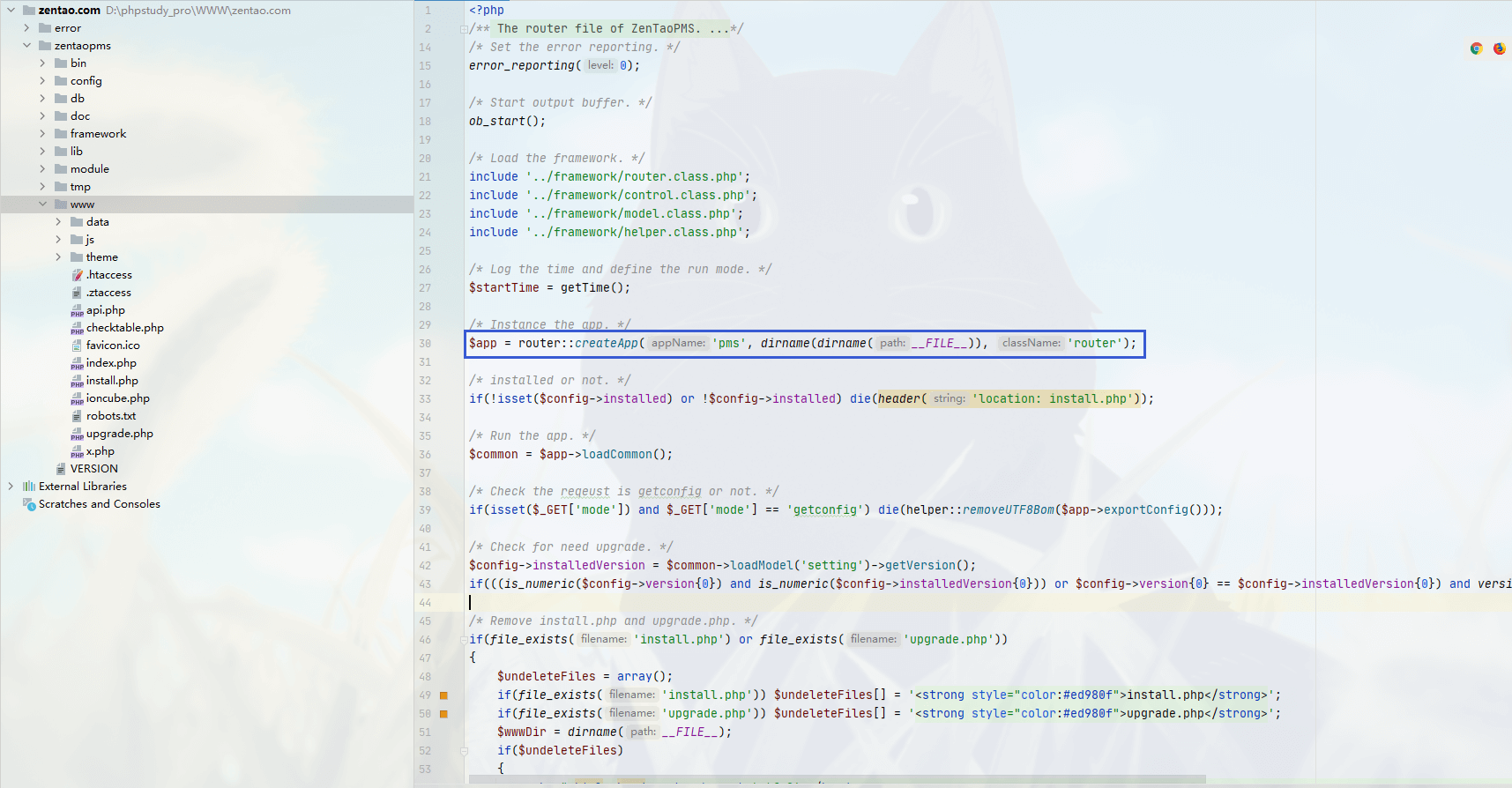 先对禅道的调用流程进行分析,先查看目录为www/index.php首页文件中
