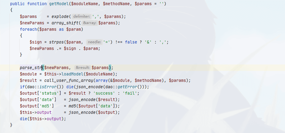 通过之前获取的moduleName包含对应的control类文件并实例化,随后调用setParamsByPathInfo方法从路径中获取方法对应的参数值,最后通过call_user_func_array方法调用对应control类中的对应方法并赋值。