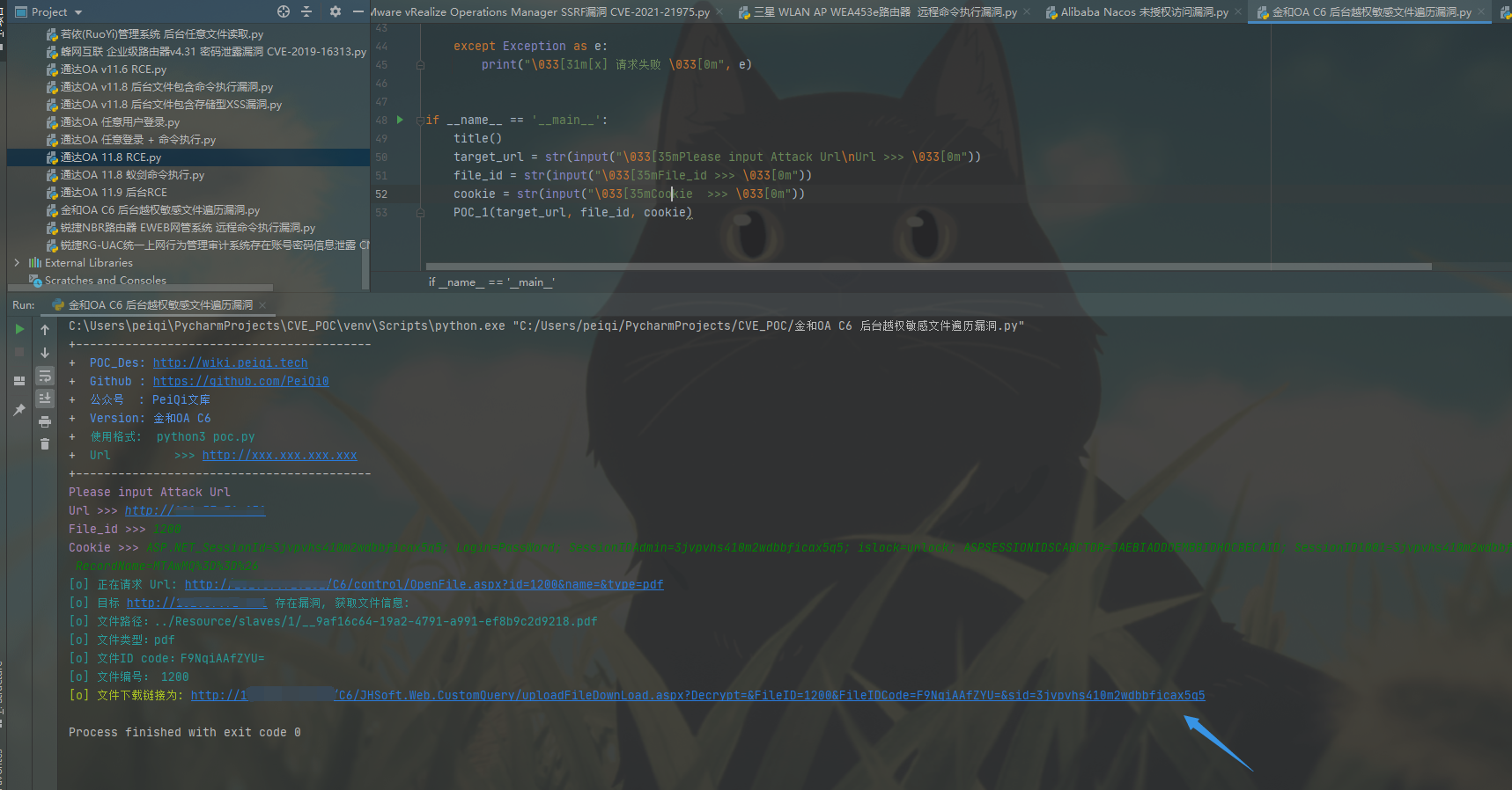 print("\033[36m[o] 目标 {} 存在漏洞, 获取文件信息:\n[o] 文件路径:{}\n[o] 文件类型:{}\n[o] 文件ID code:{}\n[o] 文件编号: {}\033[0m".format(target_url, strFilePath, strFileType,strFileIDCode, strId ))