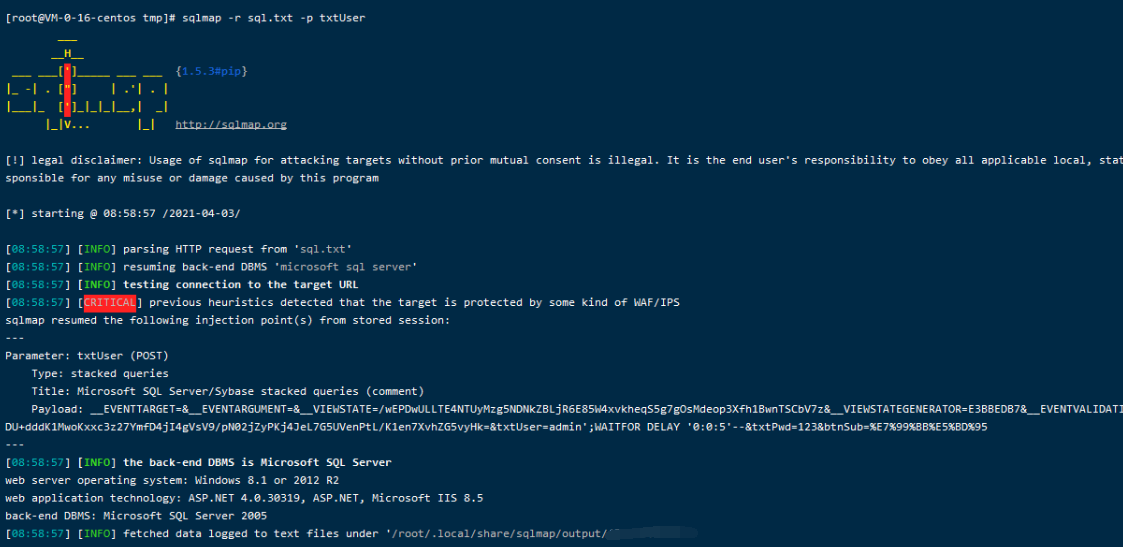 其中注入的参数为 POST数据中的 txtUser 参数, 保存为文件使用 Sqlmap跑一下