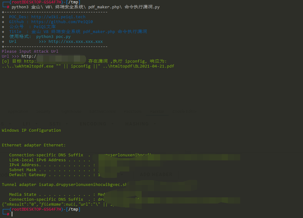 金山 V8 终端安全系统 pdf_maker.php 存在命令执行漏洞,由于没有过滤危险字符,导致构造特殊字符即可进行命令拼接执行任意命令