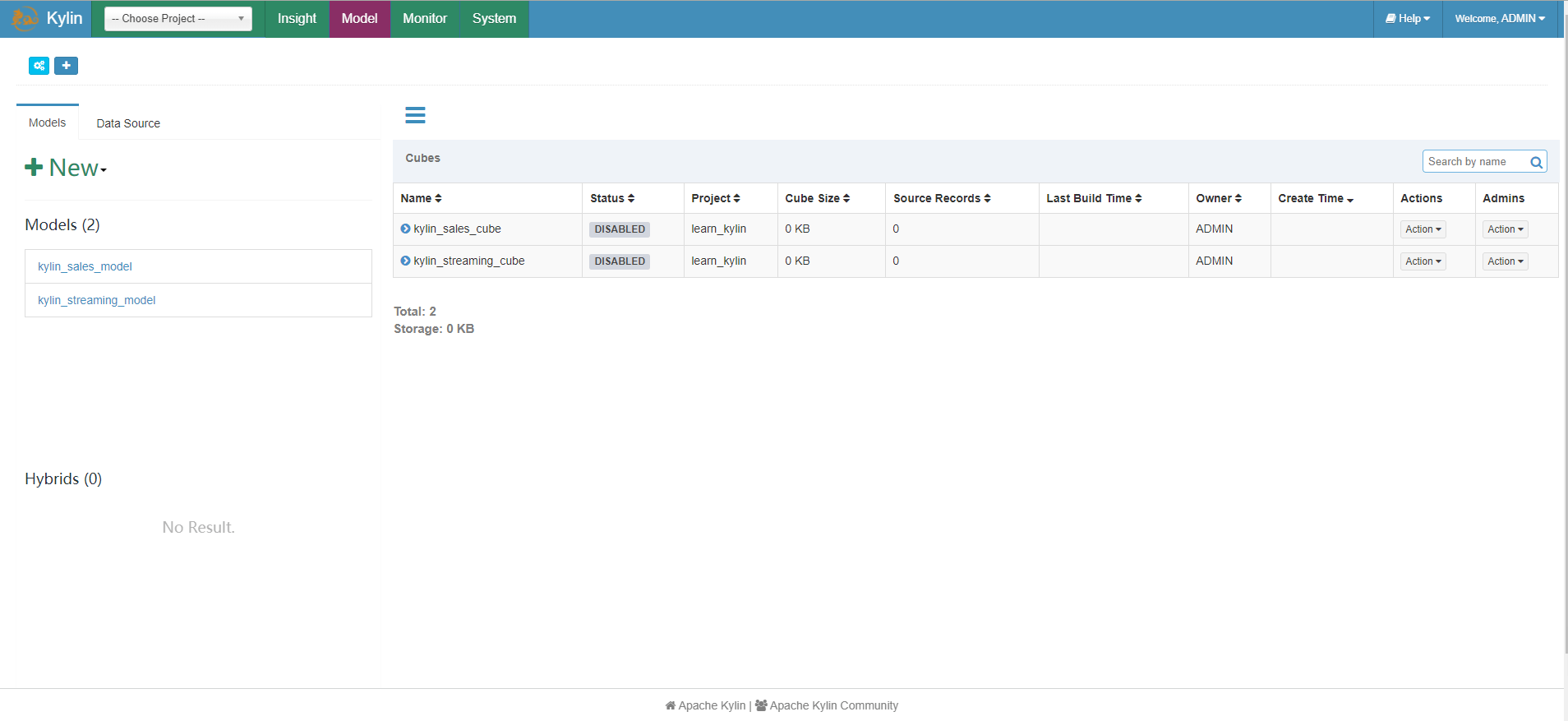 打开后目标站点使用默认账号密码admin/KYLIN登录,出现初始界面即为成功