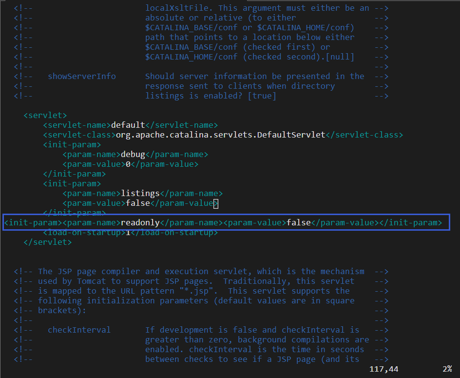 漏洞产生的主要原因来自于conf/web.xml文件配置错误,readonly开启了false,导致可以使用PUT/DELETE请求方法操作文件