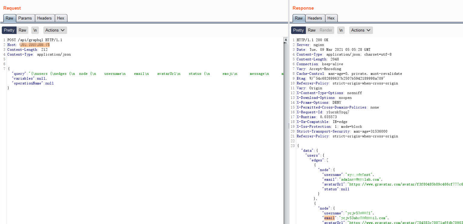 查看完报告后发现漏洞利用需要有账号用户名,在不知道的情况下无法获取邮箱,在Graphql官网查看得知可以通过另一个构造的语句一次性返回所有的用户名和邮箱