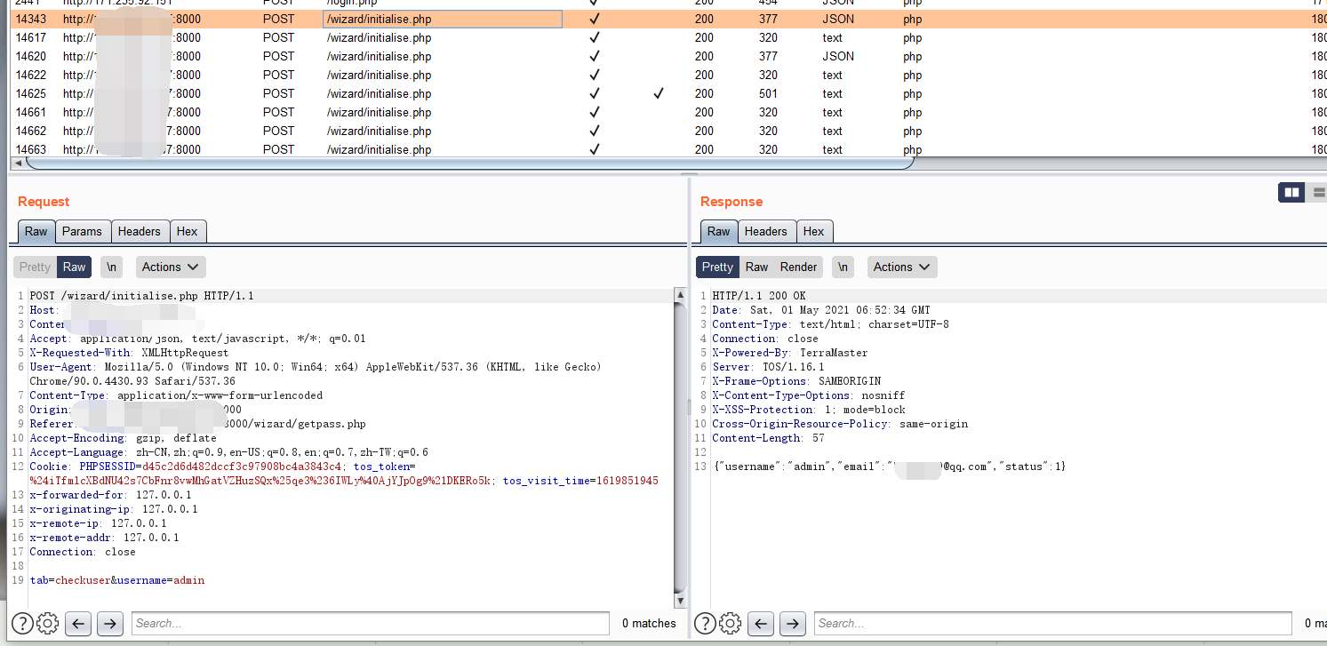 TerraMaster TOS 存在用户枚举漏洞,通过wizard/initialise.php页面的username参数即可枚举系统中的用户,以及泄露邮箱信息
