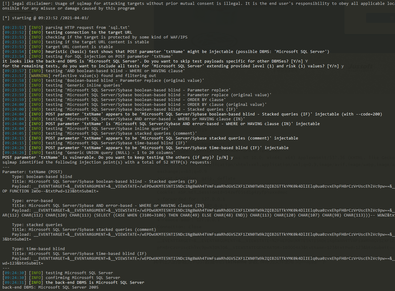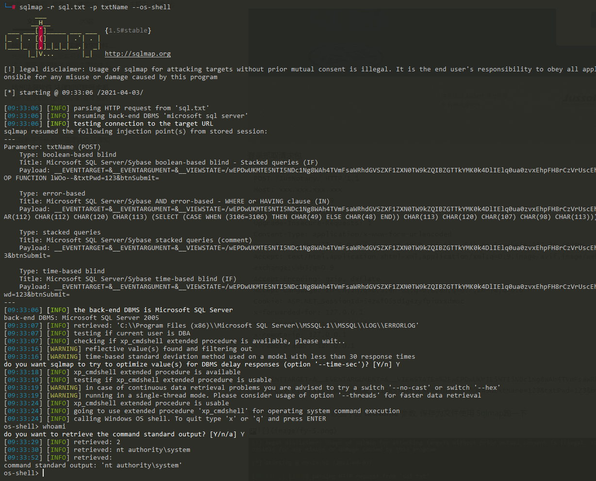 其中注入的参数为 POST数据中的 txtName 参数, 保存为文件使用 Sqlmap跑一下