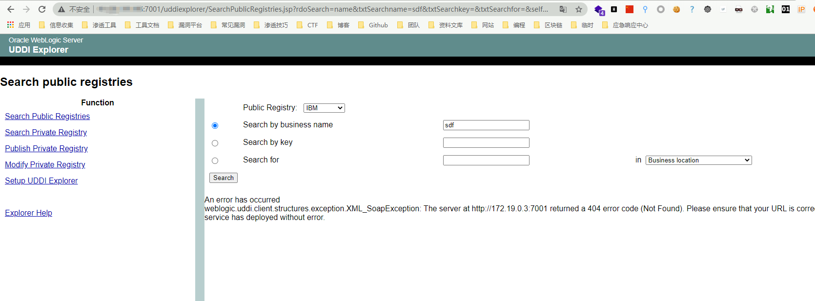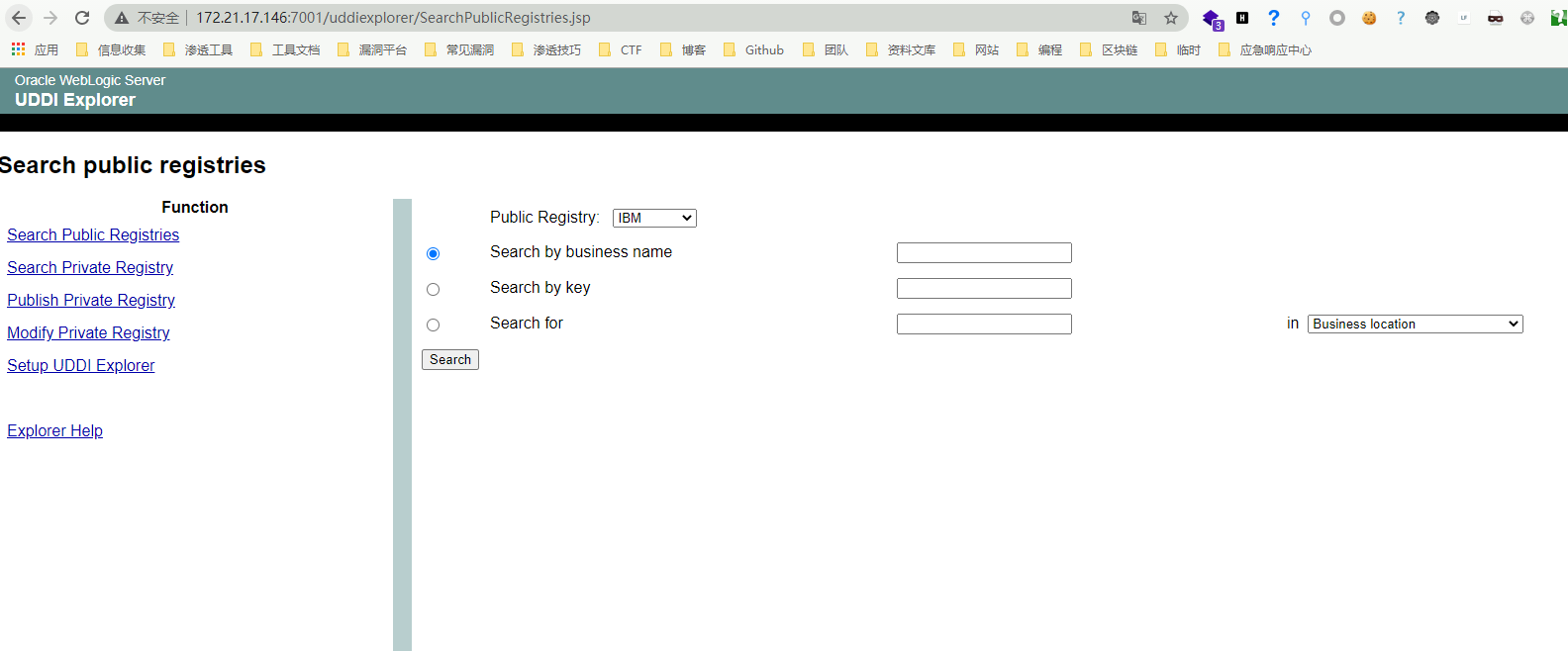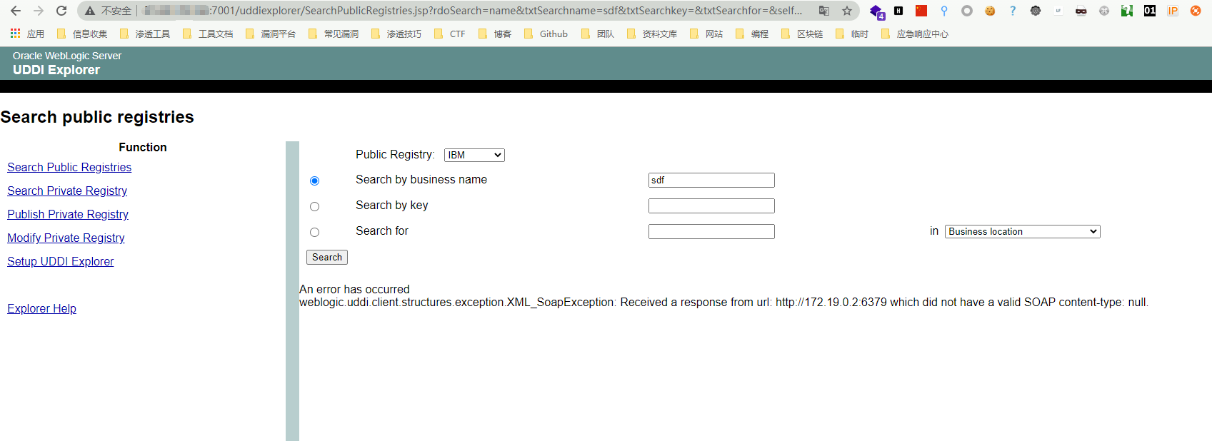 出现漏洞的 URL为 : http://xxx.xxx.xxx.xxx:7001/uddiexplorer/SearchPublicRegistries.jsp