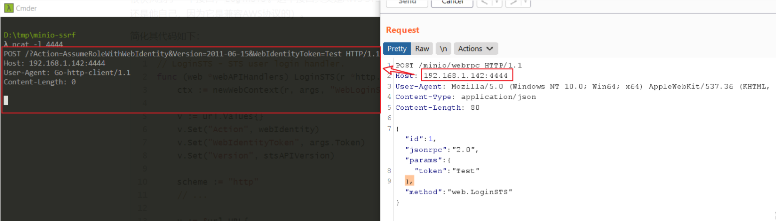 很快找到了一个接口,LoginSTS。这个接口其实是AWS STS登录接口的一个代理,用于将发送到JsonRPC的请求转变成STS的方式转发给本地的9000端口(也就还是他自己,因为它是兼容AWS协议的)。