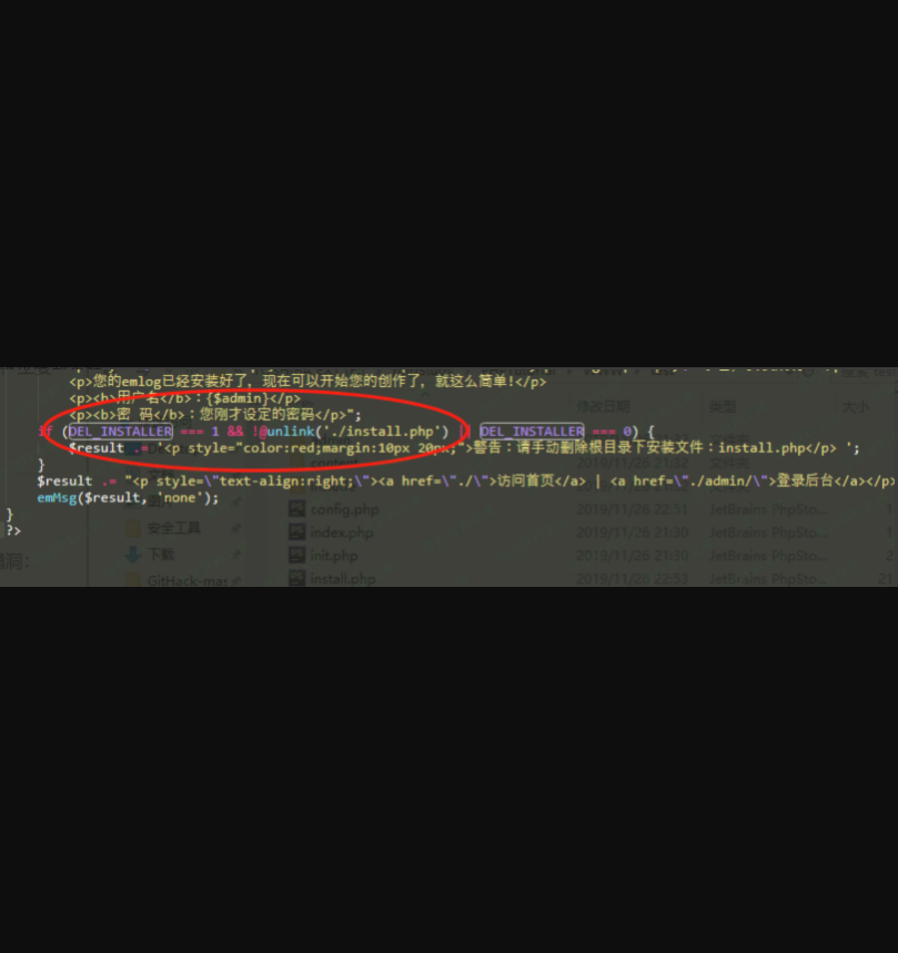 首先我们直奔第一个点能否任意重装,我们可以看到必须常量DEL_INSTALLER为1的时候才会触发删除install.php,那么我们追踪DEL_INSTALLER看看