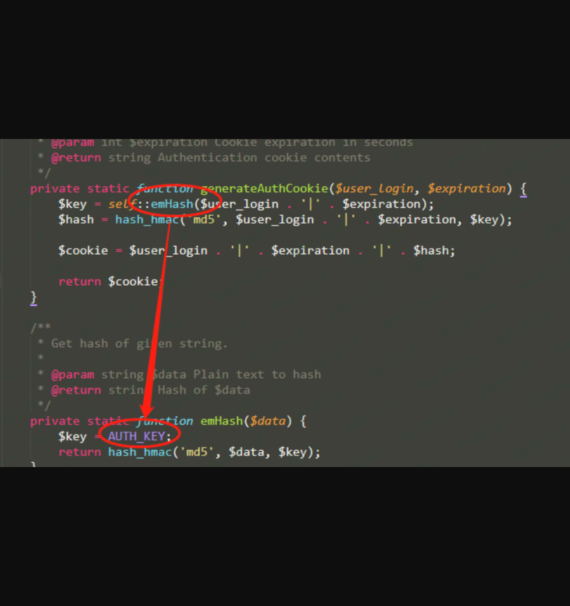我们知道generateAuthCookie方法中的 $key、$hash是由AUTH_KEY加密而成。最终的cookie是由$user_login 、 $expiration $hash拼接而成,而$expiration是cookie的生存时间,$user_login是用户名。这里可以得知$key、$user_login、$expiration都是固定的那么只要知道AUTH_KEY就有伪造cookie造成越权的可能。