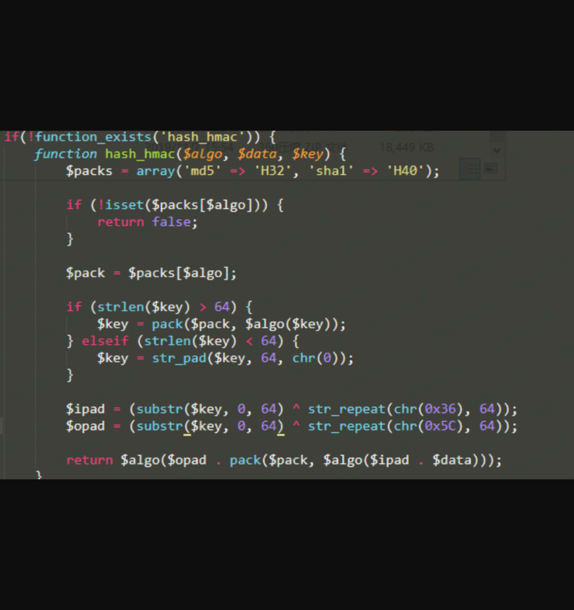 这里对传入的$key也就是AUTH_KEY进行了md5加密到一个二进制字符串中而后分割为64个字节与一个字符*64次的字符串进行异或最后得到两个字符串$ipad,$opad最后再将他们打包拼接用md5加密返回给上级调用。我们再回到上级。