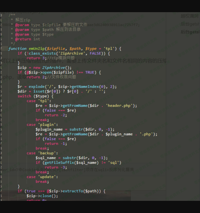 我们还发现这个cms中上传插件的地方可以上传zip,这里我们想如果在插件中插入一句话木马是不是也能getshell?我们找到插件上传的脚本,发现使用了一个叫emUnzip的函数。