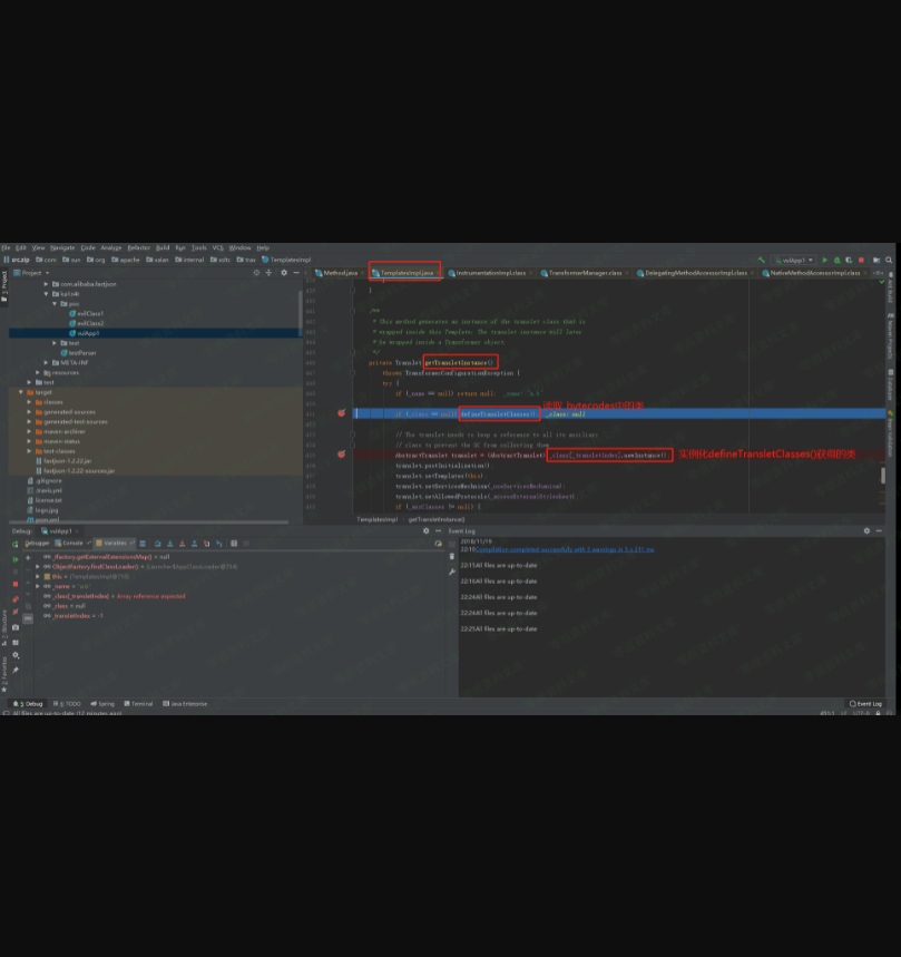 getTransletInstance()方法用于创建一个translet实例,返回这个translet给newTransformer(),然后被包裹成Transformer对象。跟进一下这个方法,发现其调用了defineTransletClasses()用来加载_bytecodes中的类,接着又调用了_class[_transletIndex].newInstance()将defineTransletClasses()返回的类进行实例化: