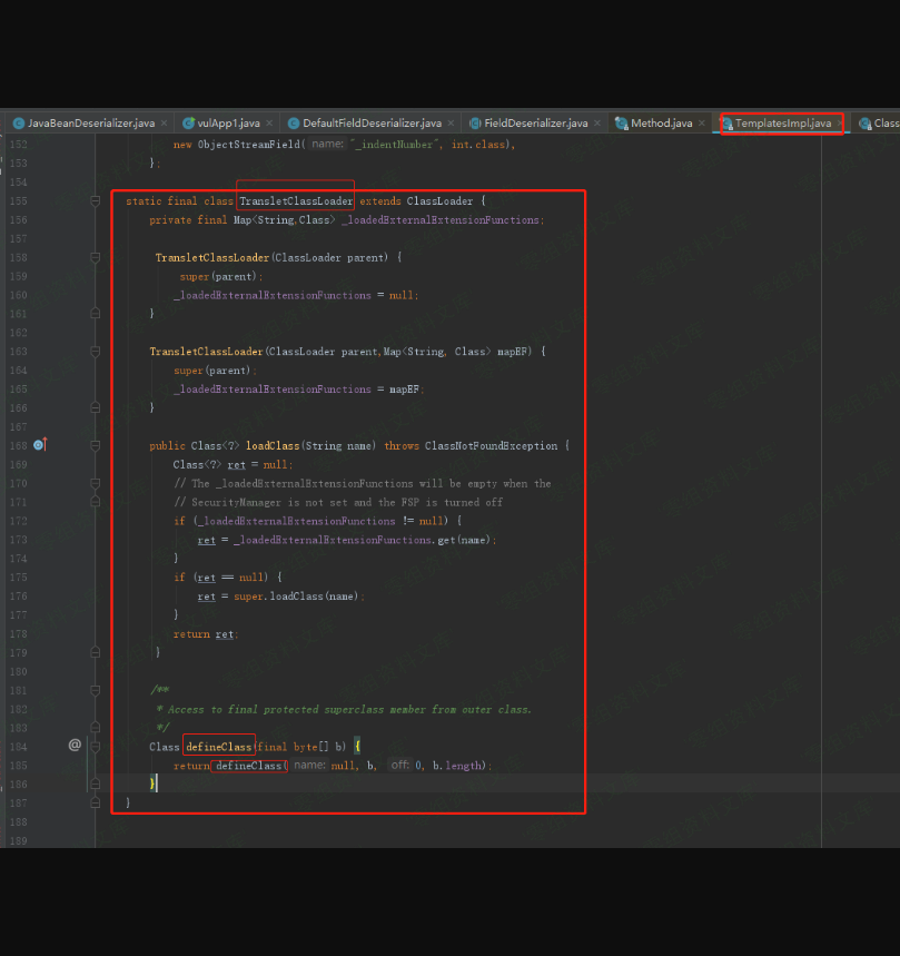 可以看到,使用了loader.defineClass()方法用于加载_bytecodes的内容,并将返回的类赋值给_class[i](这里的i是0)。loader是TemplatesImpl自定义的类,跟进一下: