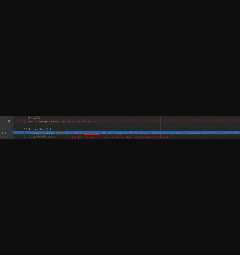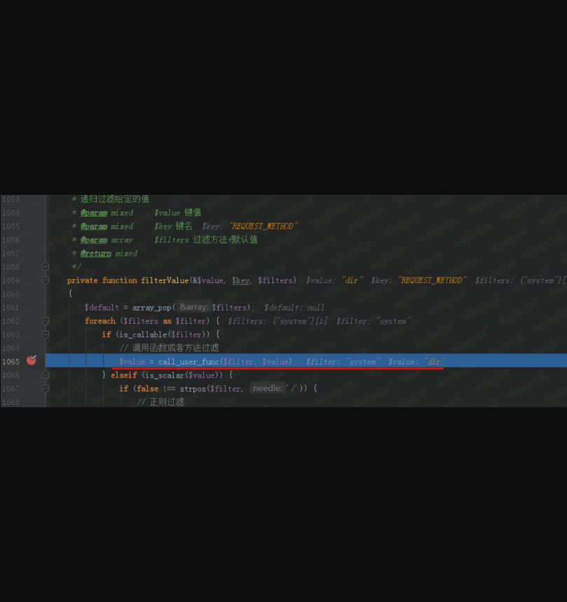通过构造使得$filter=system, $value=dir ,通过call_user_func函数即可执行系统命令" dir "。
