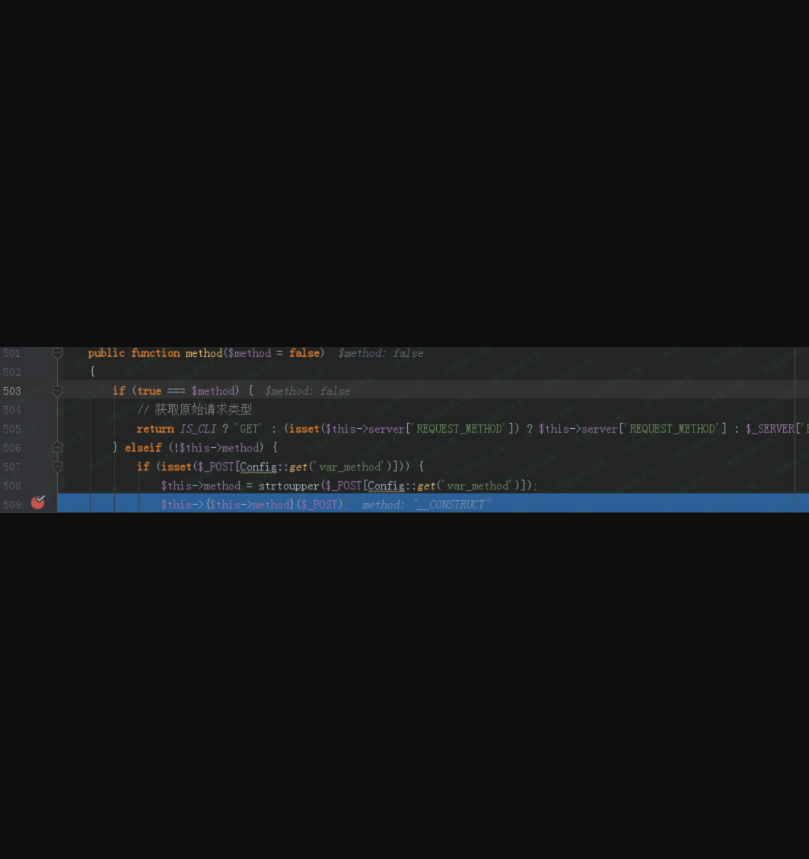 /core/library/think/Request.php类中,通过post参数_method=__construct调用构造函数: