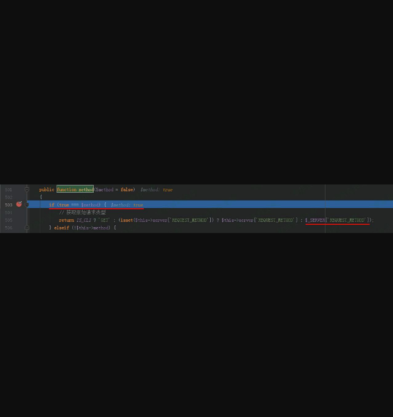post参数 method=GET 就是要再次调用method函数,并且使得if(true===$method)为真,从而获取 _SERVER[REQUEST_METHOD]=dir 这个参数值。