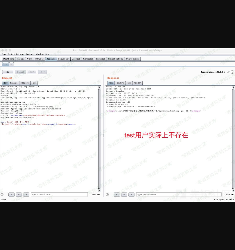 name=test' AND 1=1 AND 'inject'='inject&email=sss%40qq.com&password=ssssss&submit=