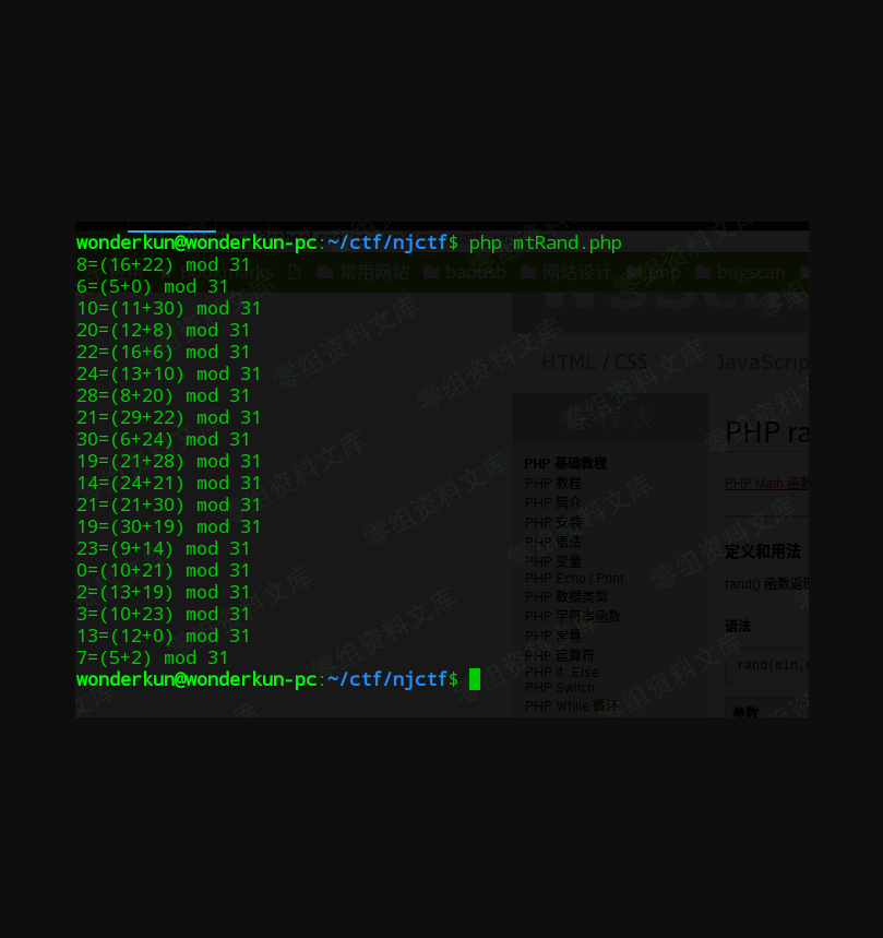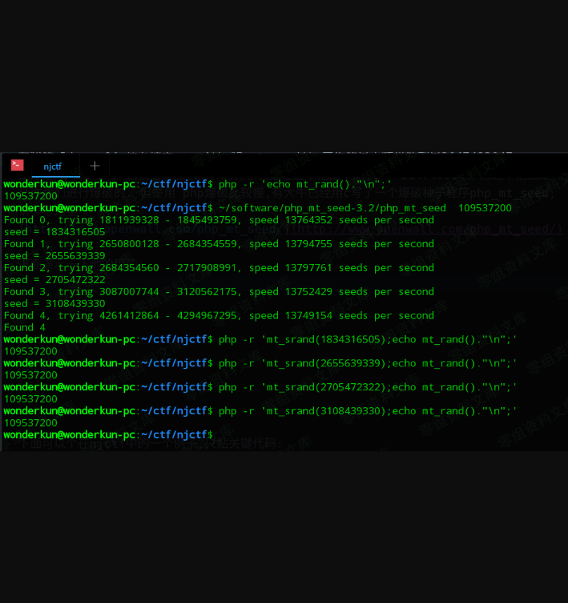➜ Desktop echo $(python -c "print '0 '*64") $(php mtRand.php) | xargs ~/script/php_mt_seed-4.0/php_mt_seed