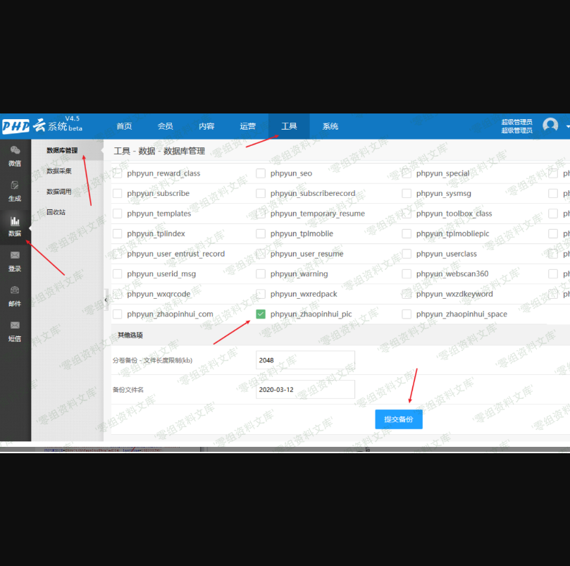 漏洞复现过程: 首先进入后台-》点击工具-》数据-》数据库管理-》自定义备份-》随便选择一个表-》提交备份