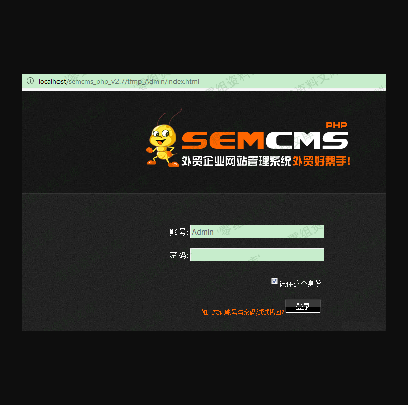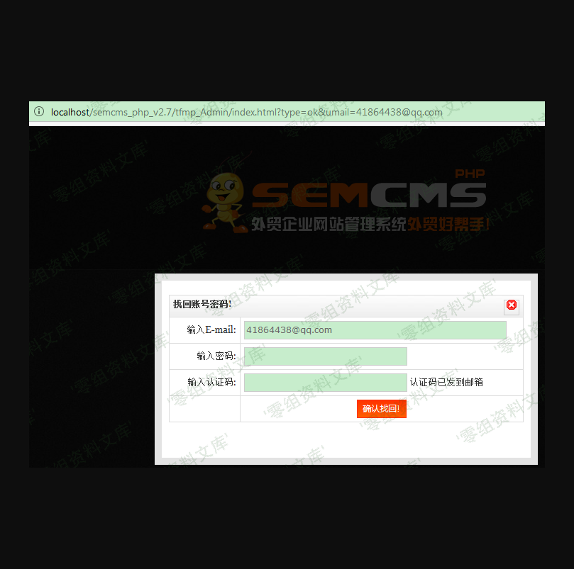 http://0-sec.org/semcms_php_v2.7/tfmp_Admin/index.html?type=ok&umail=41864438@qq.com