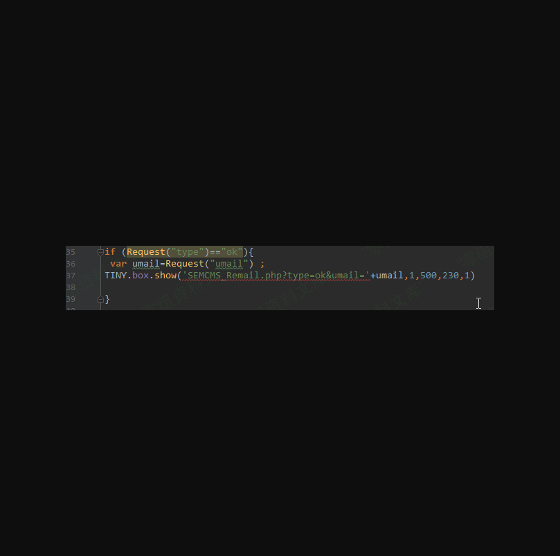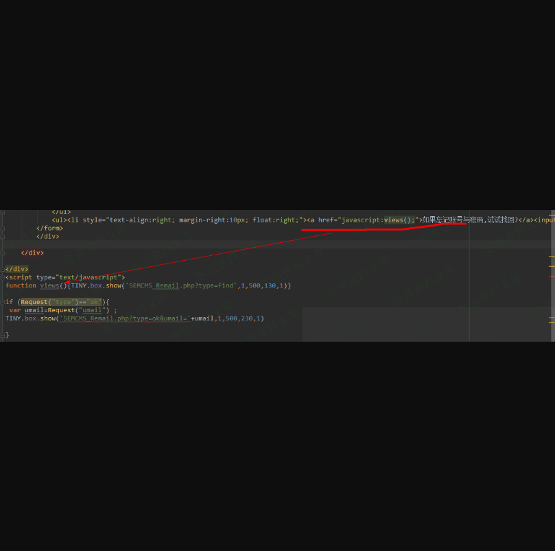 从代码可以看到,当点击登录按钮旁边的链接"如果忘记账号与密码,试试找回?",时,会执行 js的views() 函数,该函数是弹出一个对话框并向SEMCMS_Remail.php?type=find 发送请求,让用户填写要接收重置后密码的邮箱地址,如下: