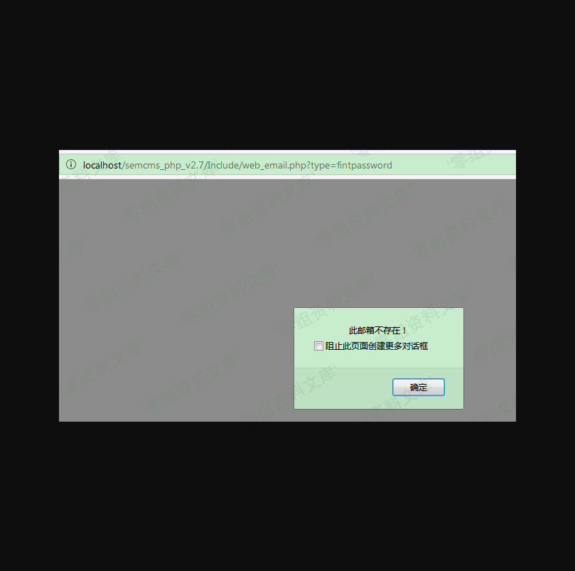 代码会根据用户输入的E-mail地址,查找 sc_user 表,看是否存在使用该E-mail地址的用户,如果存在,则随机生成4位数的认证码,并将其拼接到一个密码重置链接中,最后以邮件的形式发送给用户。用户点击邮件中的密码重置链接即可;但如果不存在,则弹出对话框,提示"此邮箱不存在!",如图:
