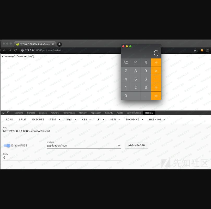 执行RCE的SQL语句已经构建好,接下来就是触发一个新的数据库连接,通过向端点/actuator/restart发送POST请求,即可重启应用出发新的数据库连接。请求如下