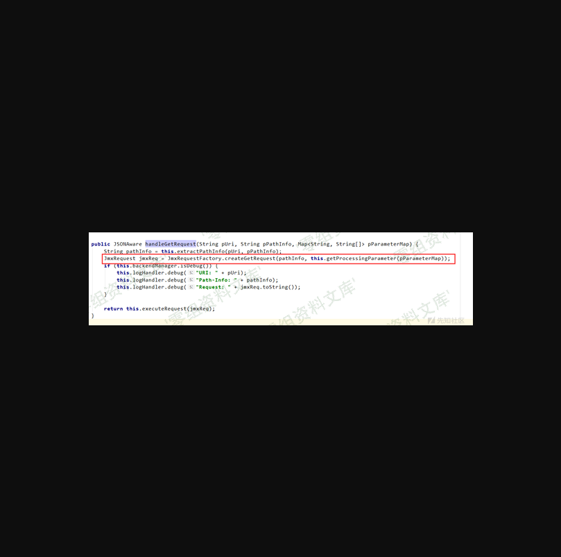只要是 /jolokia 为第一个 path 节点的,都会进入它的执行逻辑中,可以一直跟进到org.jolokia.http.HttpRequestHandler#handleGetRequest 里