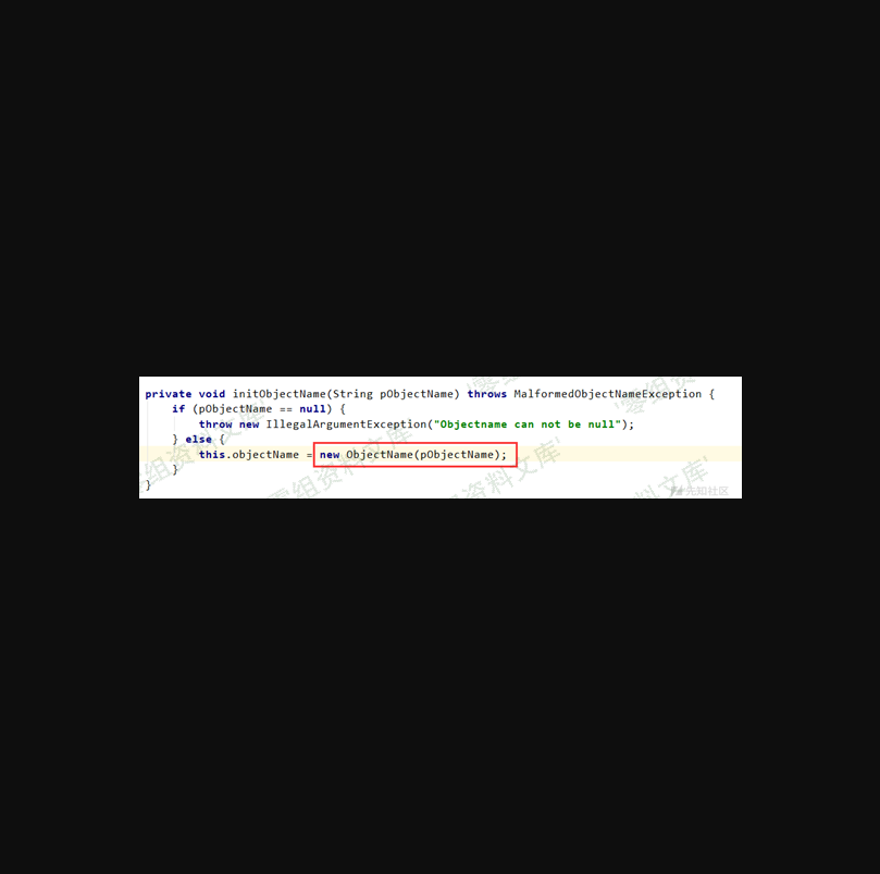 如上图,这里将 exec 后面的第一个 path 节点带进了 javax.management.ObjectName 构造函数中