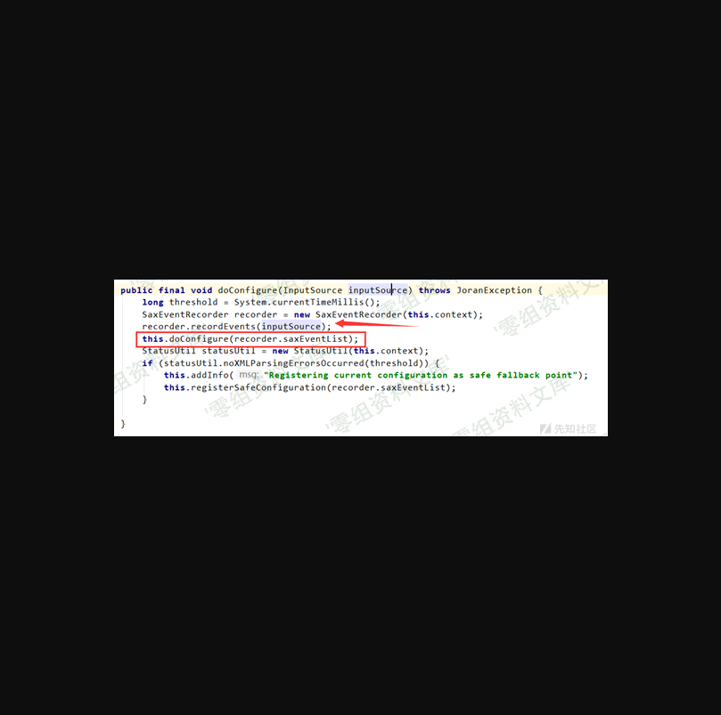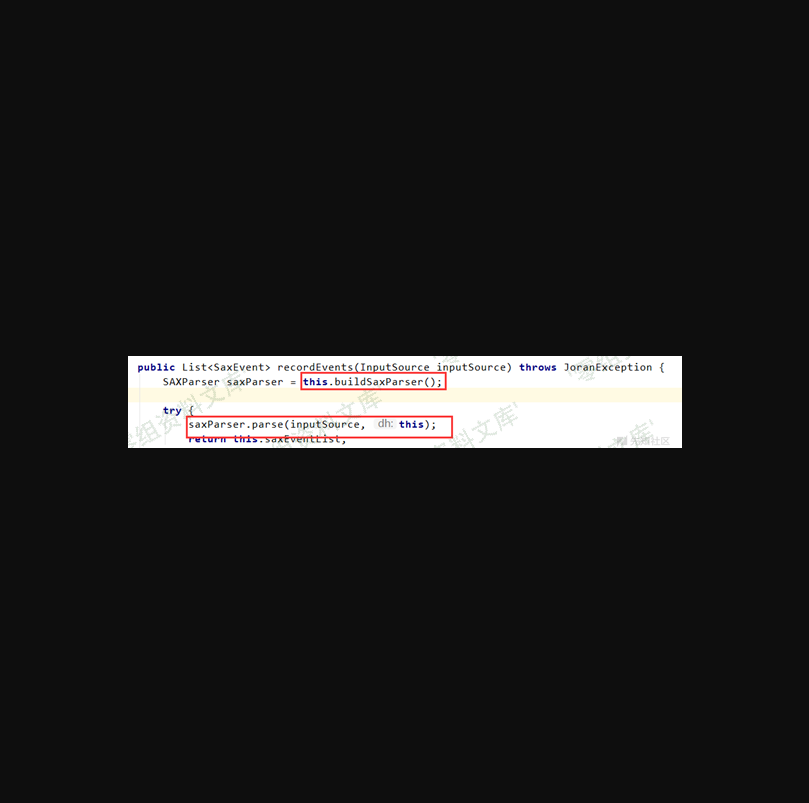 如上图所示,在调用 recordEvents 的时候带入了输入流,这个输入流是我们可控的,即在自己服务器上放置的 xml 文件, xml 解析的过程就是发生在 recordEvents 的执行过程中,而后红框的调用,是对已经解析完成的内容进行一定的逻辑操作,然后重载配置,后面的过程就不分析了,简单的去看一下 recordEvents 执行过程,如下