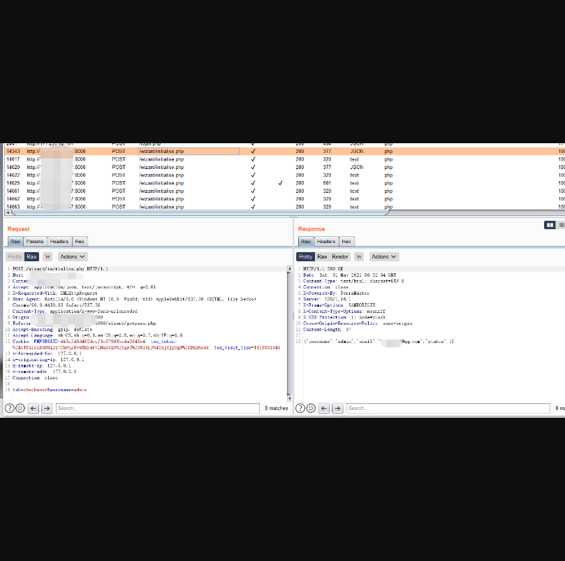 TerraMaster TOS 存在用户枚举漏洞,通过wizard/initialise.php页面的username参数即可枚举系统中的用户,以及泄露邮箱信息