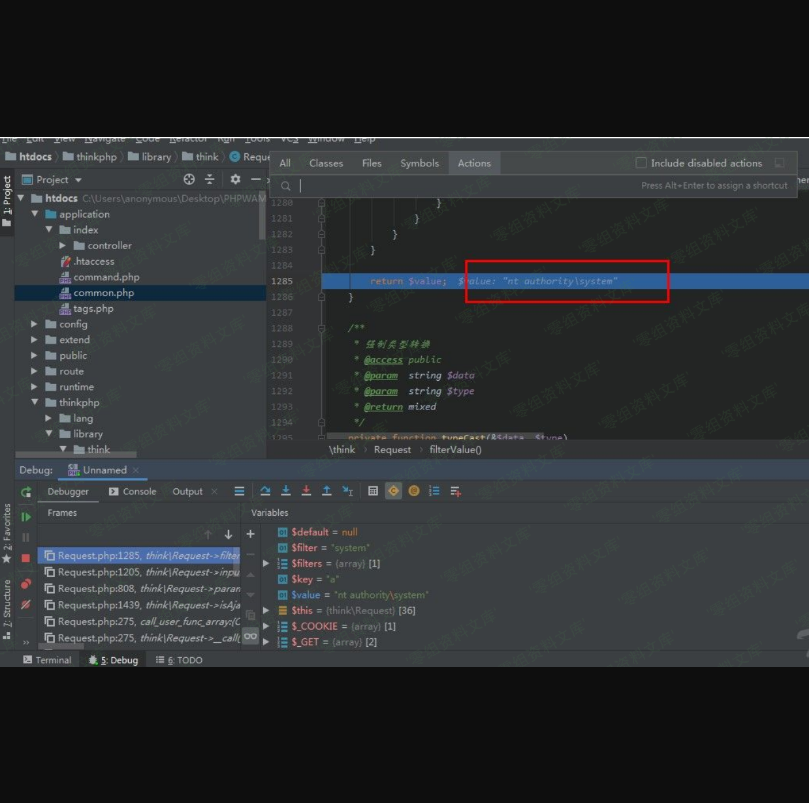 虽然$this->hook可控,但是由于array_unshift函数的作用,导致$args数组中会加入新的数组,所以判断不好利用。但是他是一个回调函数,可以以$this->hook[$method]=[$this,methodName]这种形式回调函数。在Request类中查找call_user_func_array这种类型的函数,最后找到filterValue函数。filterValue函数里面的call_user_func_array方法是这个漏洞的触发点。回溯$filter和$value