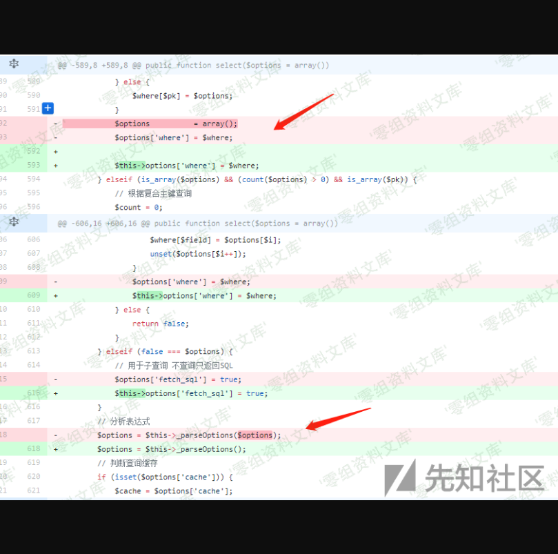 可以看到在整个对$options的解析中没有过滤,直接返回,跟进到底层ThinkPHP\Libray\Think\Db\Diver.class.php,找到select方法,继续跟进最后来到parseSql方法,对$options的值进行替换,解析。