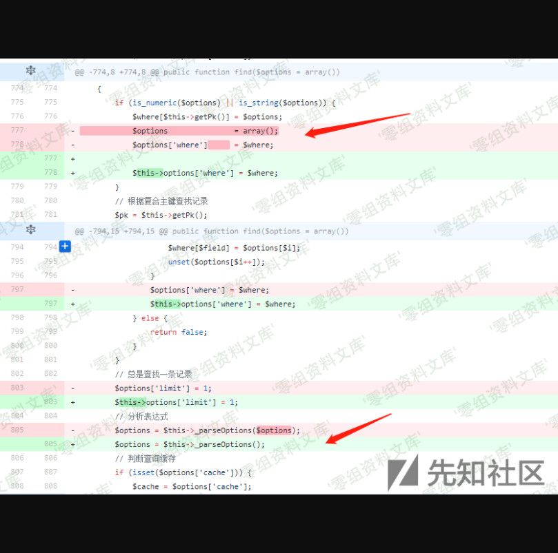 那么就可以使$options为数组,同时找到一个表只有一个主键,就可以绕过两次判断,直接进入_parseOptions进行解析。